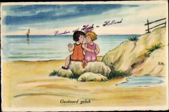 Künstler Ak Hummer zwickt Kinder in den Po, Strandleben