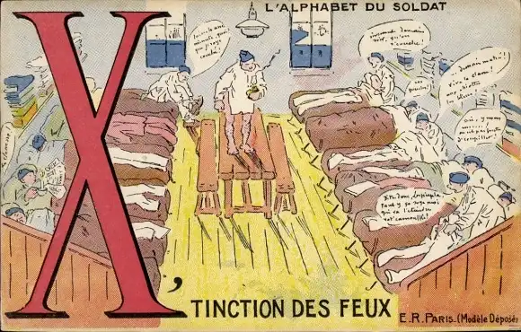 Künstler Ak Humor, Französische Armee, Alphabet des Soldaten, Licht aus