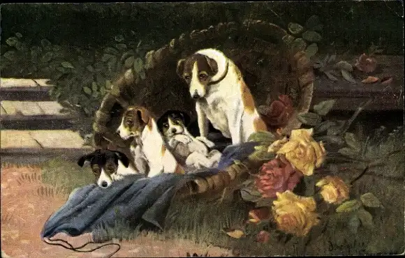 Künstler Ak Hunde, Terrier mit drei Welpen in einem Weidenkorb, Blaue Decke