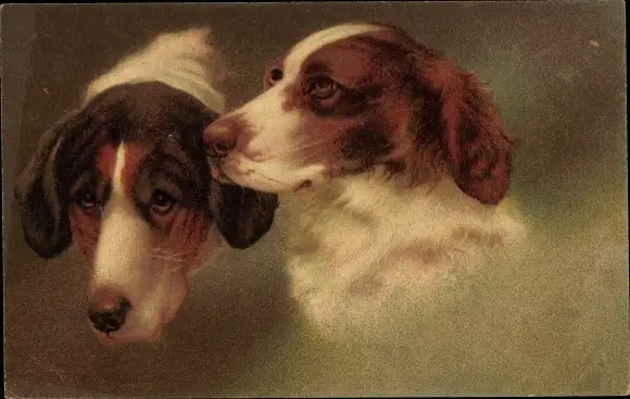 Künstler Ak Hundeportraits, zwei braun weiße Hunde mit mittellangem Fell