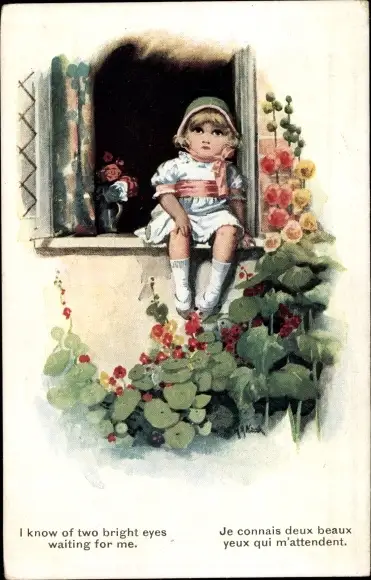 Künstler Ak I know of two bright eyes waiting for me, Mädchen sitzt auf dem Fensterbrett