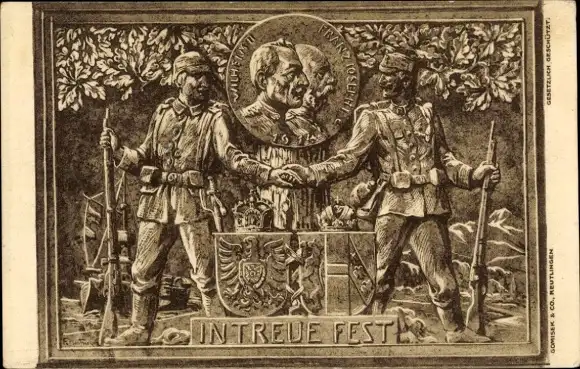Künstler Ak In Treue Fest, Kaiser Wilhelm II., Kaiser Franz Josef I., Wappen