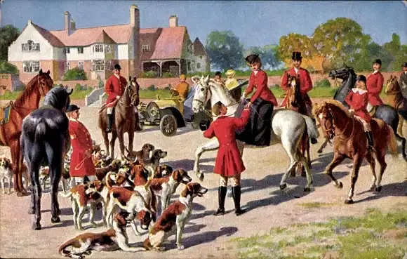 Künstler Ak Jagdszene, Hetzjagd, Jäger auf ihren Pferden, Meute, Jagdhunde