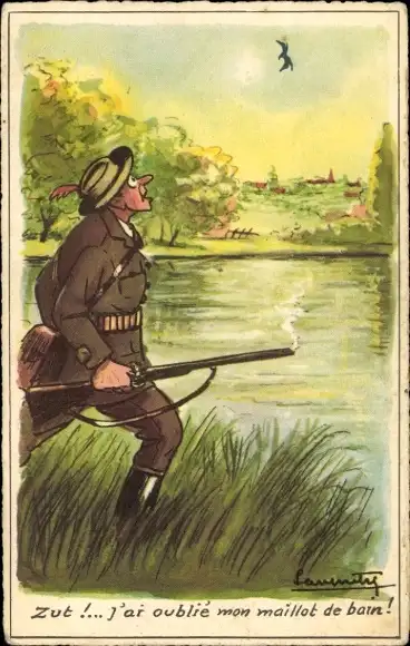 Künstler Ak Jagdszene, abgeschossener Vogel fällt in den See