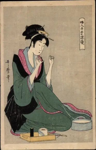 Künstler Ak Japan, Frau im Kimono, Nähgarn