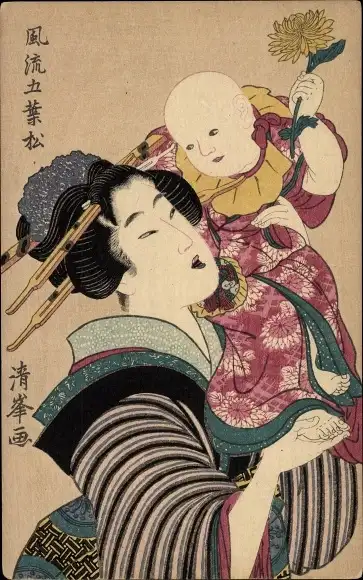 Künstler Ak Japan, Frau mit Kind auf dem Arm
