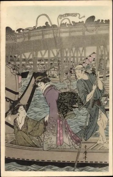 Künstler Ak Japan, Frauen und Mann in Volkstrachten in einem Boot