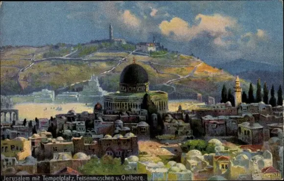 Künstler Ak Jerusalem Israel, Tempelplatz, Felsenmoschee, Oelberg