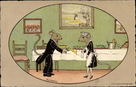 Künstler Ak Jordens, Bep, Vermenschlichte Mäuse, Champagne Schenken, Kellnerin