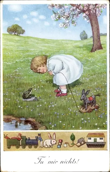 Künstler Ak Jüchtzet, F., Tu mir nichts, Mädchen, Frosch, Spielzeuge