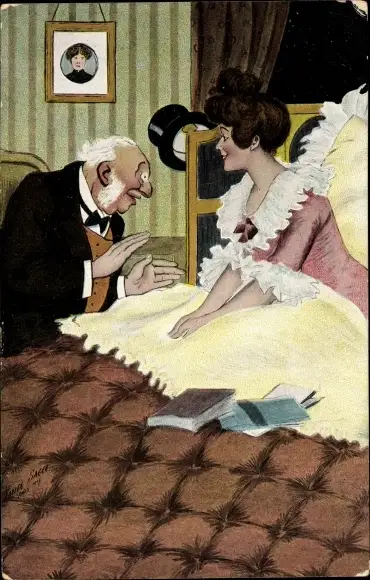 Künstler Ak Junge Frau im Bett, Alter Freier