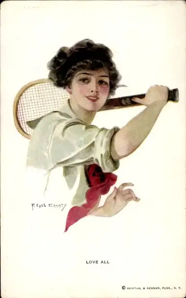 Künstler Ak Junge Frau mit Tennisschläger