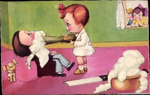 Künstler Ak Junge beim Barbier, Rasierpinsel