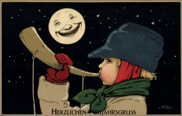 Künstler Ak Junge mit Horn, Musikinstrument, Mond