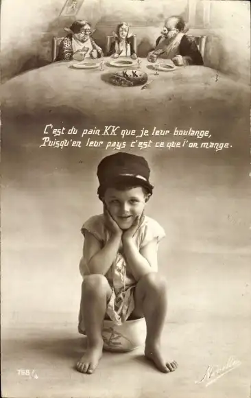 Künstler Ak Junge mit Uniformmütze auf dem Nachttopf