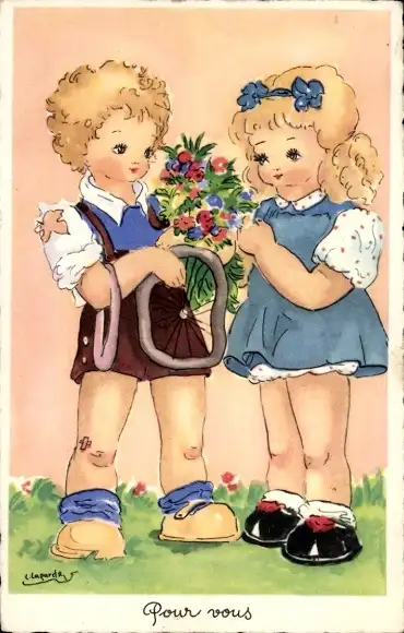 Künstler Ak Junge schenkt einem Mädchen Blumen, kaputte Fahrradreifen