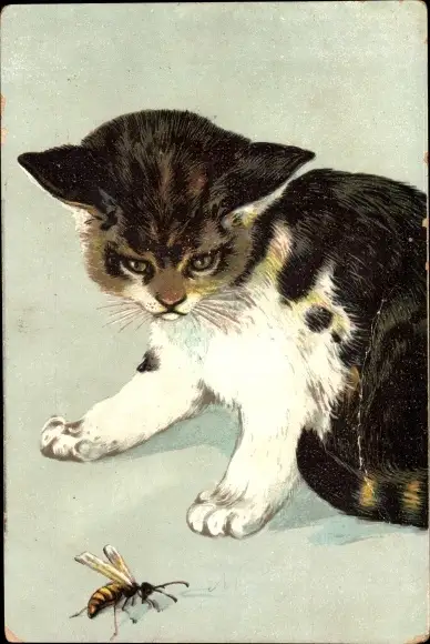 Künstler Ak Kätzchen beobachtet eine Wespe