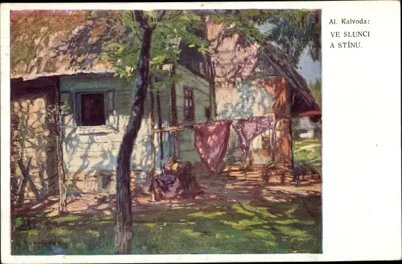 Künstler Ak Kalvoda, A., Dorfidyll, Wohnhaus, Wäscheleine