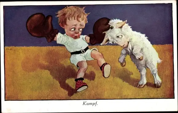 Künstler Ak Kampf, Junge mit Boxhandschuhen, Ziege, Boxkampf