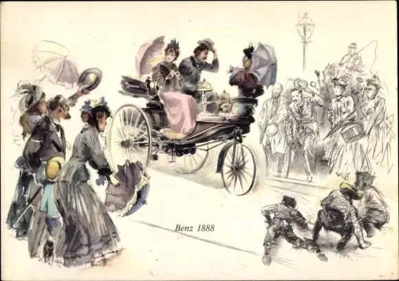 Künstler Ak Karl Benz und Frau in einem Automobil, Mercedes Benz 1888
