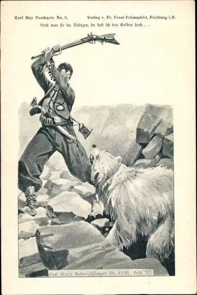 Künstler Ak Karl May, Reiseerzählungen, Mann im Kampf mit einem Eisbär