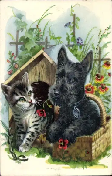 Künstler Ak Katze in der Hundehütte, Terrier im Korb