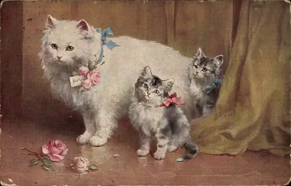 Künstler Ak Katzenmutter mit zwei Kitten, Rosen, Stroefer 1698