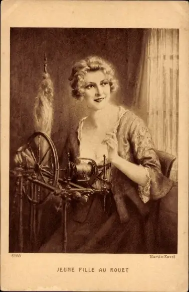 Künstler Ak Kavel, M., Frau am Spinnrad, Portrait