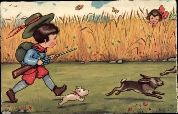 Künstler Ak Kind als Jäger, Hasenjagd, Hund, Amag 0318