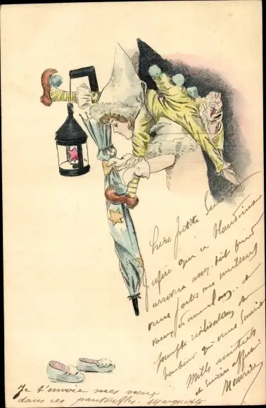 Künstler Ak Kind mit Clowns Puppe und Laterne