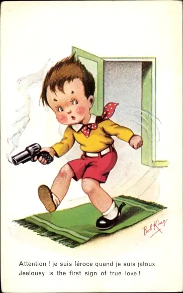 Künstler Ak King, Bob, Jealousy is the first sign of true love, Junge mit rauchendem Revolver