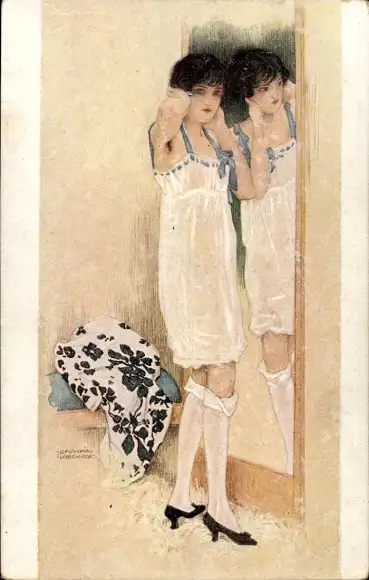 Künstler Ak Kirchner, R., Dame im Unterkleid vor dem Spiegel