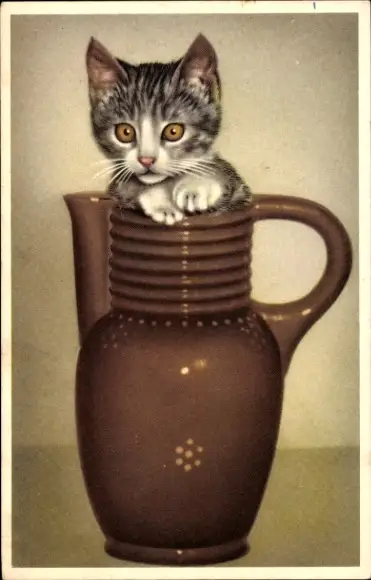 Künstler Ak Kleine getigerte Katze in einem Tonkrug