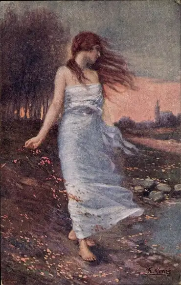 Künstler Ak Klimes, Im Winde, Frau mit langem Haar