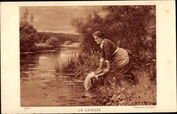 Künstler Ak Knight, R., Frau am Flussufer beim Wäschewaschen, La Laveuse
