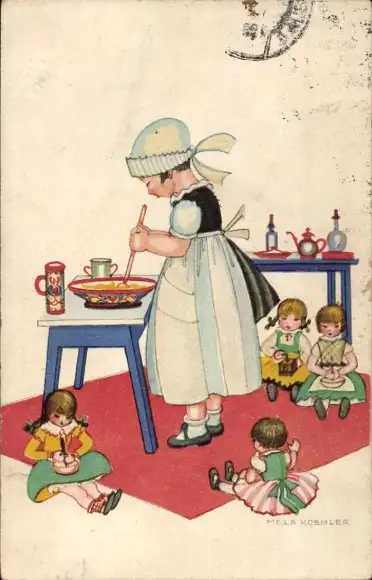 Künstler Ak Köhler, Mela, Mädchen beim Backen, Puppen