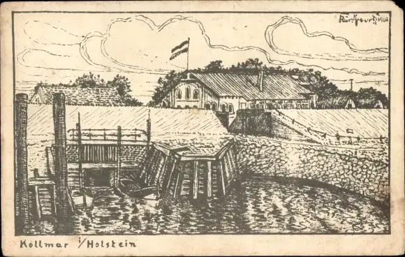 Künstler Ak Kollmar an der Niederelbe, Gebäude, Fahne, Gewässer