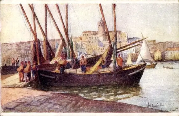 Künstler Ak Konstantinopel Istanbul Türkei, Fischerboot wird ausgeladen