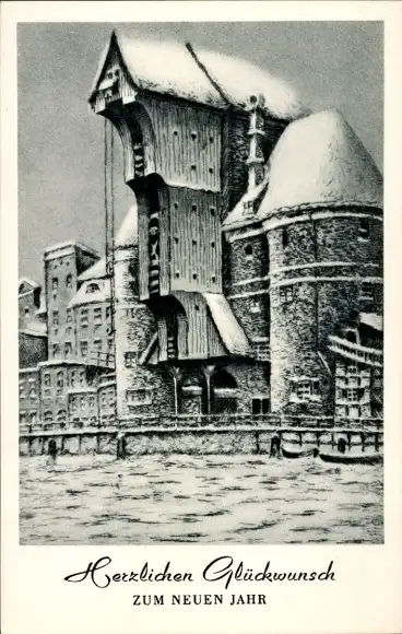 Künstler Ak Kreisel, Paul, Gdańsk Danzig, Glückwunsch Neujahr, Krantor, Schnee