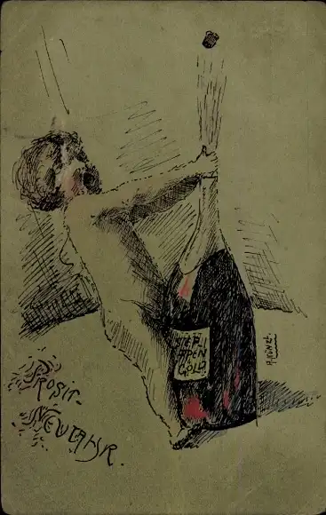 Künstler Ak Künzl, A., Glückwunsch Neujahr, Kind, Sektflasche