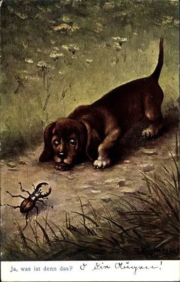 Künstler Ak Kuglmayr, M., Dackel entdeckt einen Hirschkäfer, ja was ist denn das