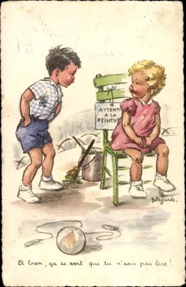 Künstler Ak Lagarde, Mädchen sitzt auf frisch gestrichener Bank