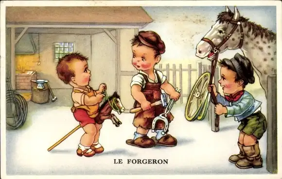 Künstler Ak Le Forgeron, Kinder, Schmied, Pferd, Steckenpferd, Amboss, Hufeisen