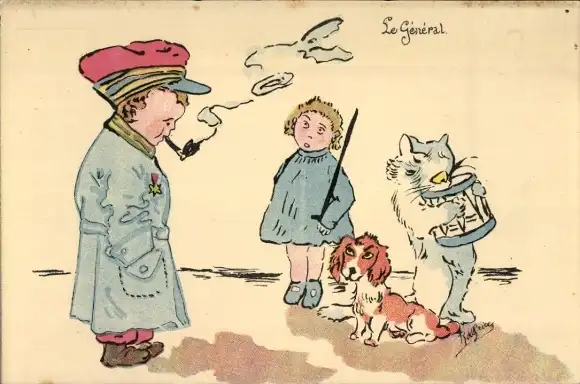 Künstler Ak Le Général, Kinder spielen Krieg, Junge in Uniform, Pfeife, Tiere
