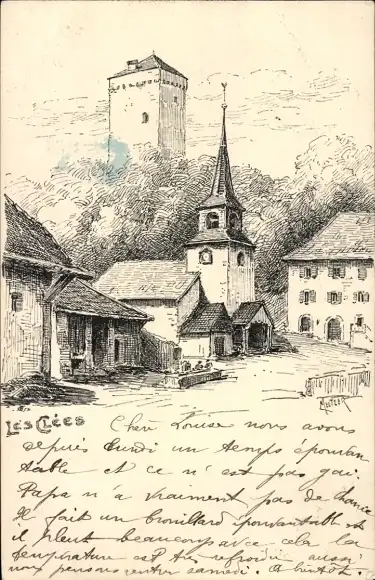 Künstler Ak Les Clées Kanton Waadt, Ortspartie, Kirche, Turm