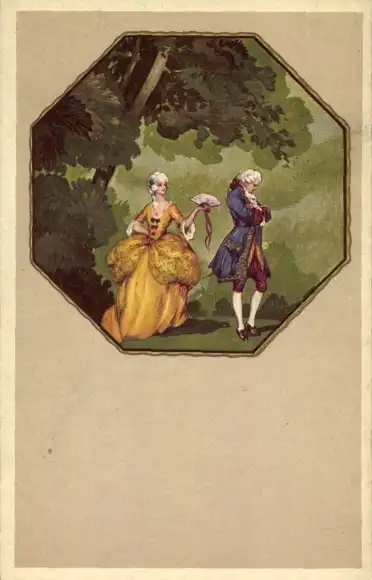 Künstler Ak Liebespaar, Frau mit Fächer, gelbes Kleid