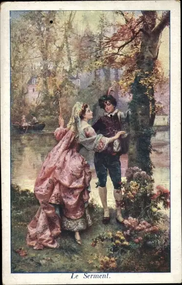 Künstler Ak Liebespaar am Fluss, Ruderboot