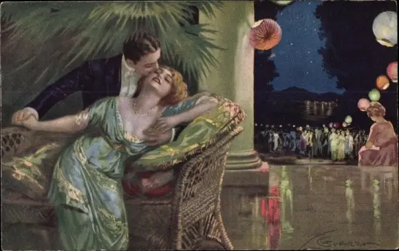 Künstler Ak Liebespaar beim Kuss, Festgesellschaft