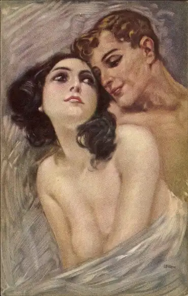 Künstler Ak Liebespaar nackt im Bett, Busen