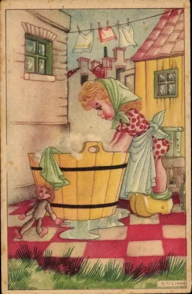Künstler Ak Links, Karel L., Mädchen wäscht Wäsche, Puppe